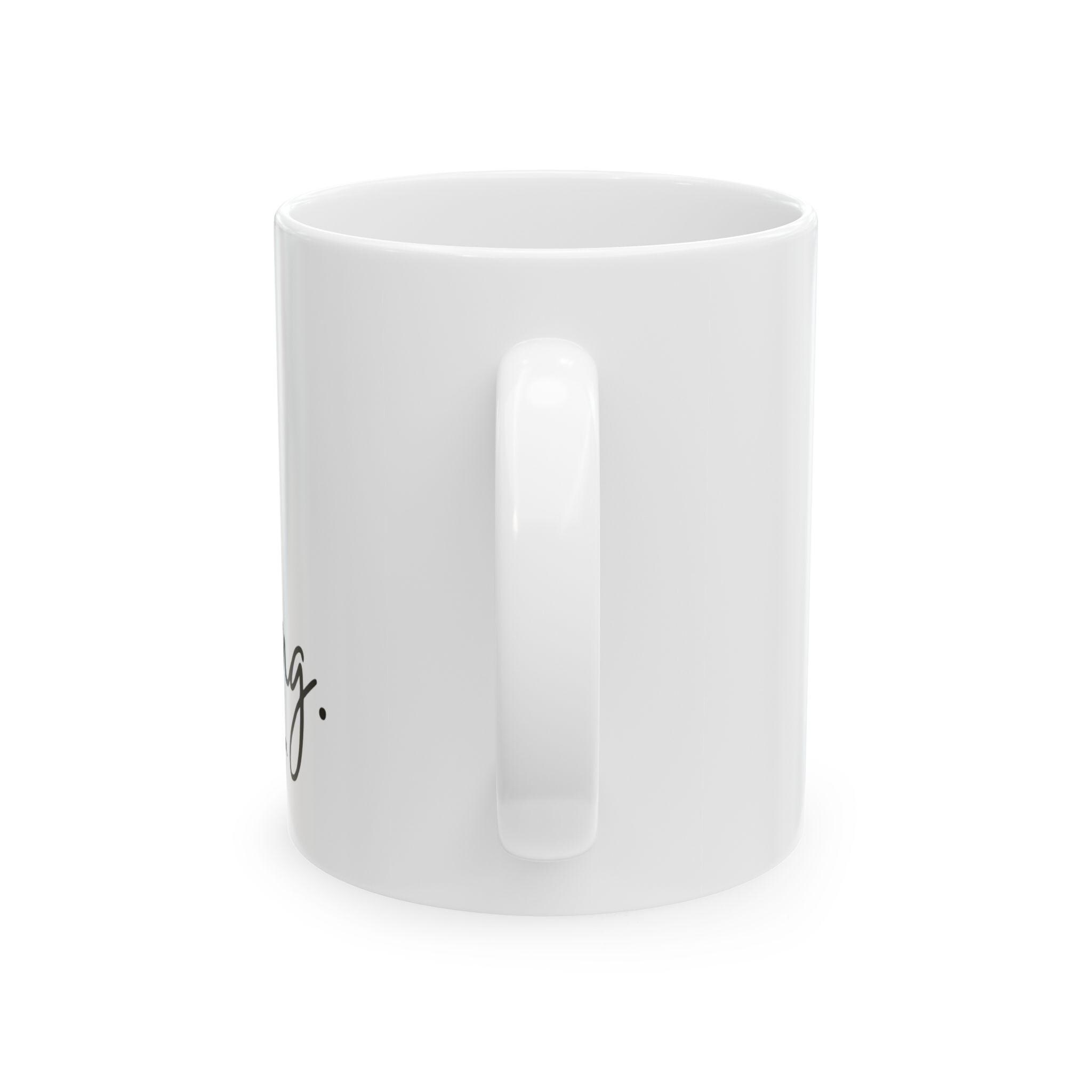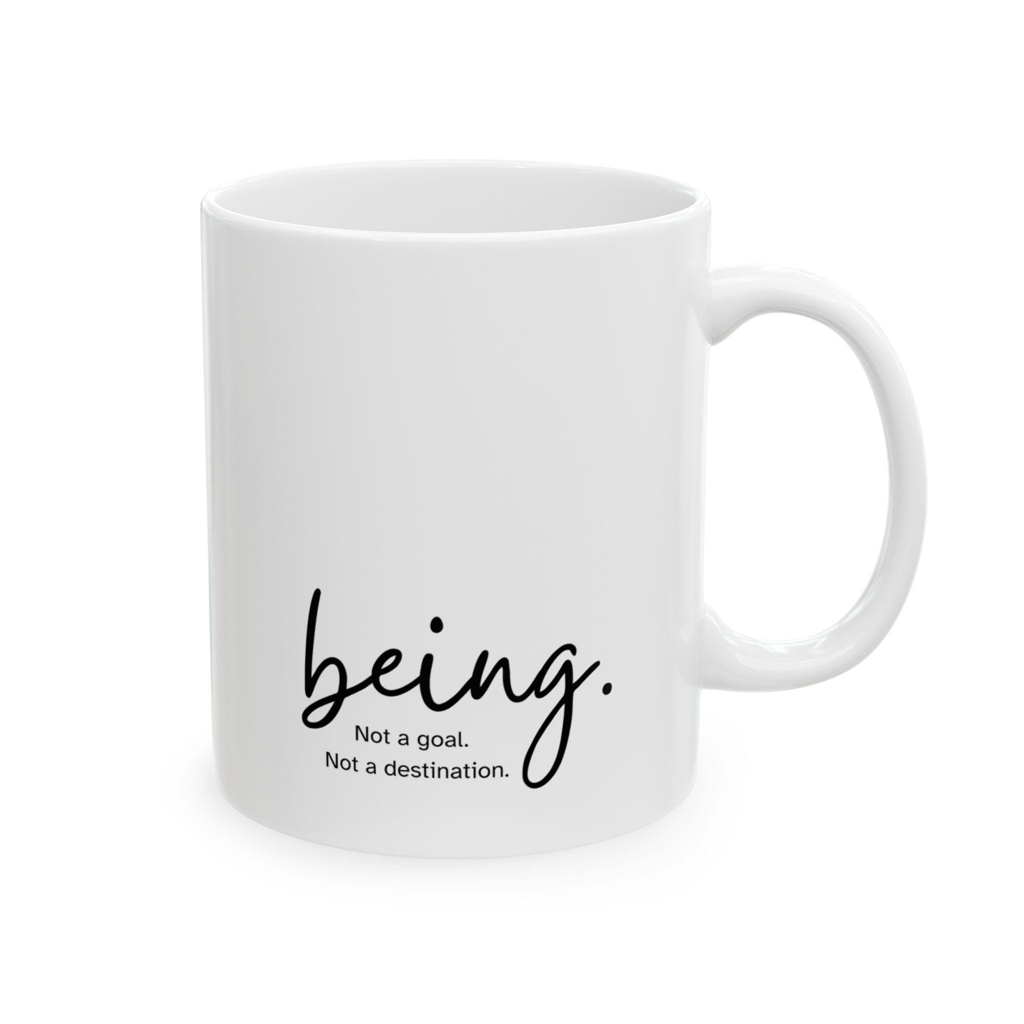 This white ceramic mug carries a quiet reminder: being is not a goal, not a destination. The minimalist black script and clean layout bring a calm, intentional energy to morning coffee, afternoon tea, or desk-side moments. Lightweight but sturdy, its glossy finish makes the typography pop while the comfortable C-handle keeps hands cozy during slow sips. Slip it into a work-from-home routine, a mindful morning ritual, or a cozy evening wind-down to anchor small, restorative pauses throughout the day.